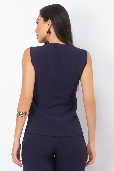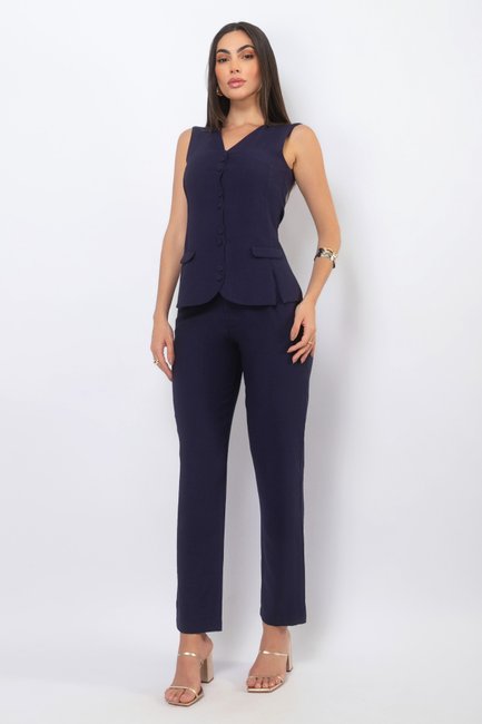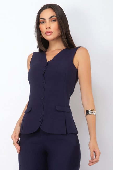 Silhueta Perfeitamente Estruturada: O grande diferencial desta peça é a sua modelagem de alfaiataria. Com recortes verticais (pences) estratégicos na frente e nas costas, o colete se ajusta ao corpo de forma impecável, desenhando e valorizando a silhueta de maneira muito elegante.