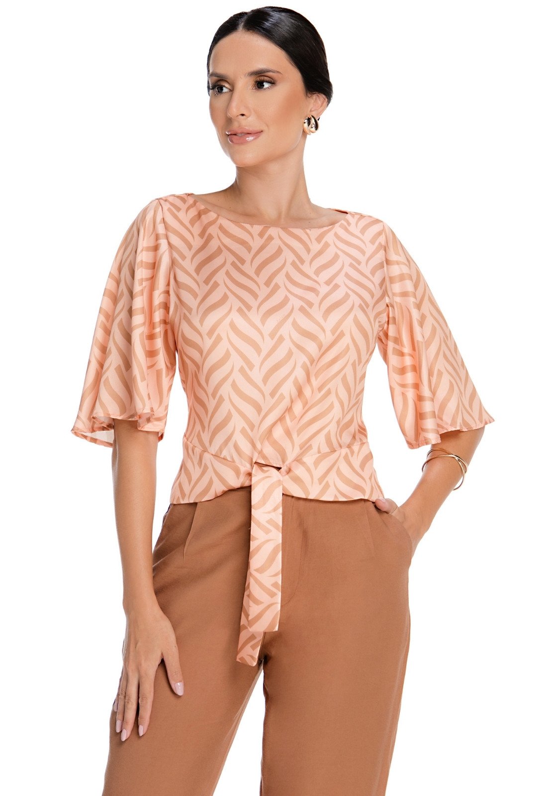 Esta blusa estampada é perfeita para quem busca um visual elegante e descontraído. Com um design sofisticado, ela apresenta mangas amplas que proporcionam leveza e fluidez ao movimento. O detalhe de amarração na cintura realça a silhueta, enquanto a estampa sutil em tons de pêssego adiciona um toque de modernidade. A blusa oferece conforto e durabilidade, sendo ideal para diversas ocasiões, desde o ambiente de trabalho até eventos casuais. Combine com calças de alfaiataria ou saias para um look completo e estiloso.