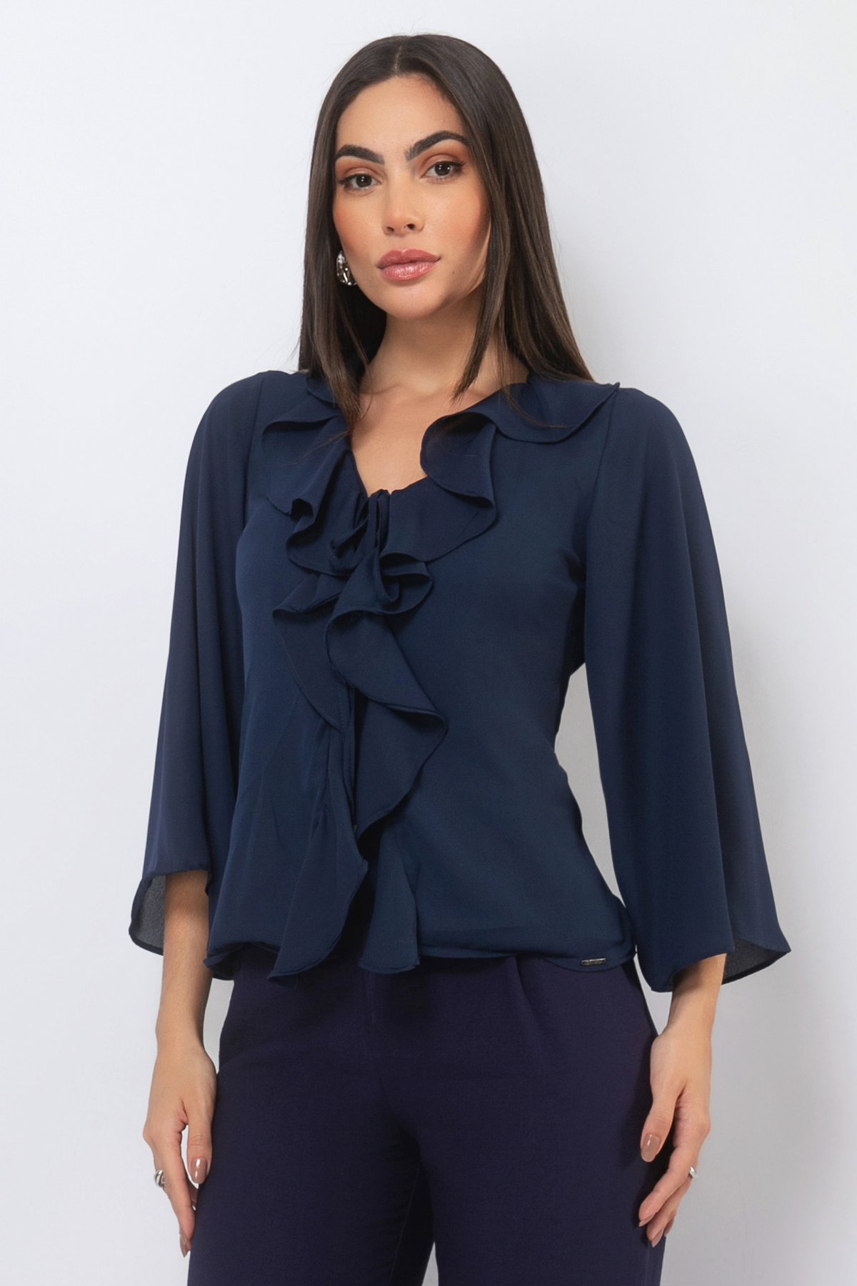 Decote com Babados em Cascata (Jabot): O ponto alto da peça é o acabamento frontal. Babados generosos descem desde a gola em formato de cascata (estilo jabot), criando um volume vertical que chama a atenção para o centro do corpo, enriquecendo o visual sem precisar de acessórios extras.