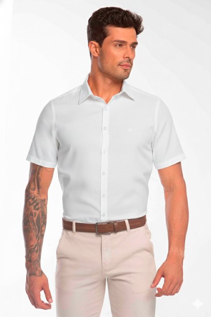 Textura "Square" Sofisticada: O grande diferencial é o tecido maquinetado, que apresenta uma elegante microtextura quadriculada ("Square"). Este acabamento confere um relevo sutil e um visual muito mais rico e trabalhado do que o de uma camisa branca lisa tradicional.