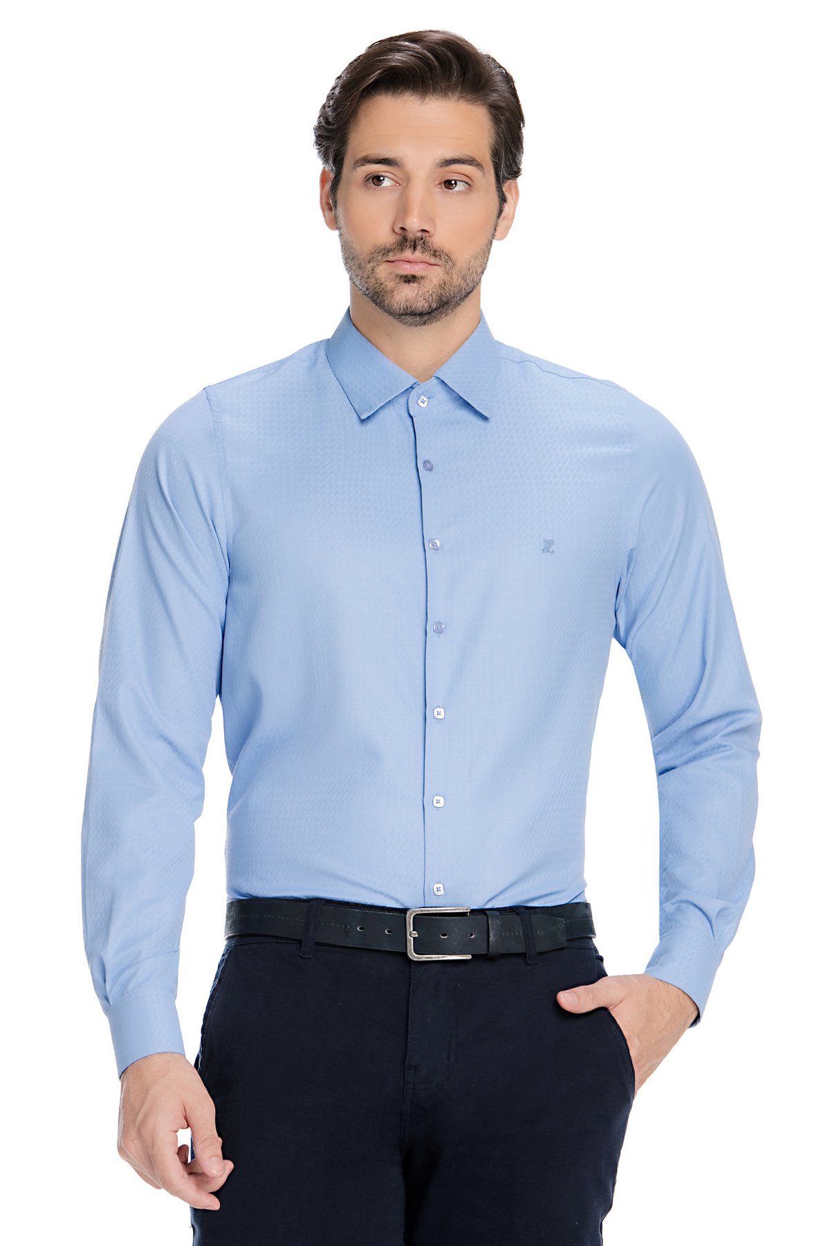 Elegância na Textura Maquinetada: O grande diferencial desta camisa é o seu tecido maquinetado, que apresenta uma microtextura geométrica muito sutil. Este acabamento confere uma profundidade visual e um toque de sofisticação que eleva a peça muito além de uma camisa lisa tradicional.