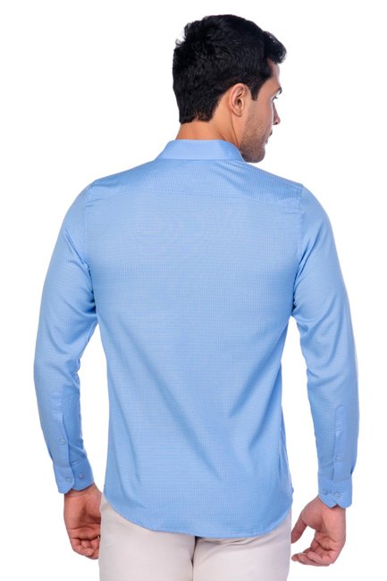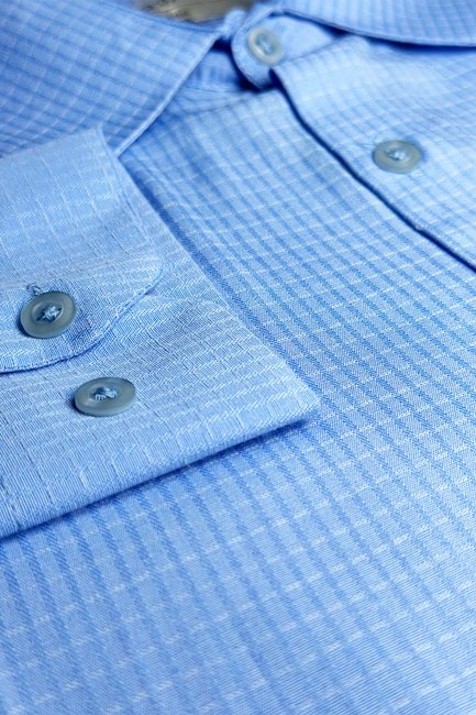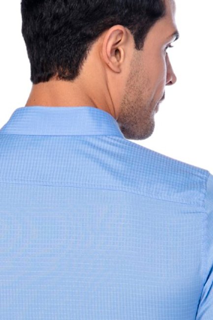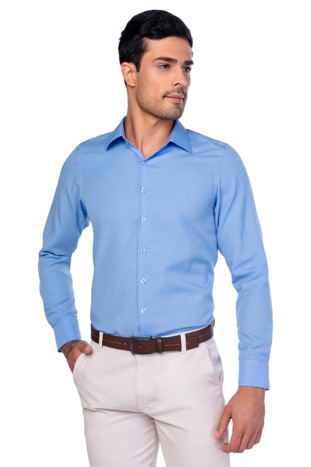O grande diferencial é o seu tecido maquinetado, que apresenta uma microtextura elegante, quase como uma trama diagonal sutil. Este acabamento confere uma profundidade visual e um toque de requinte que eleva a peça muito além de uma camisa lisa básica.