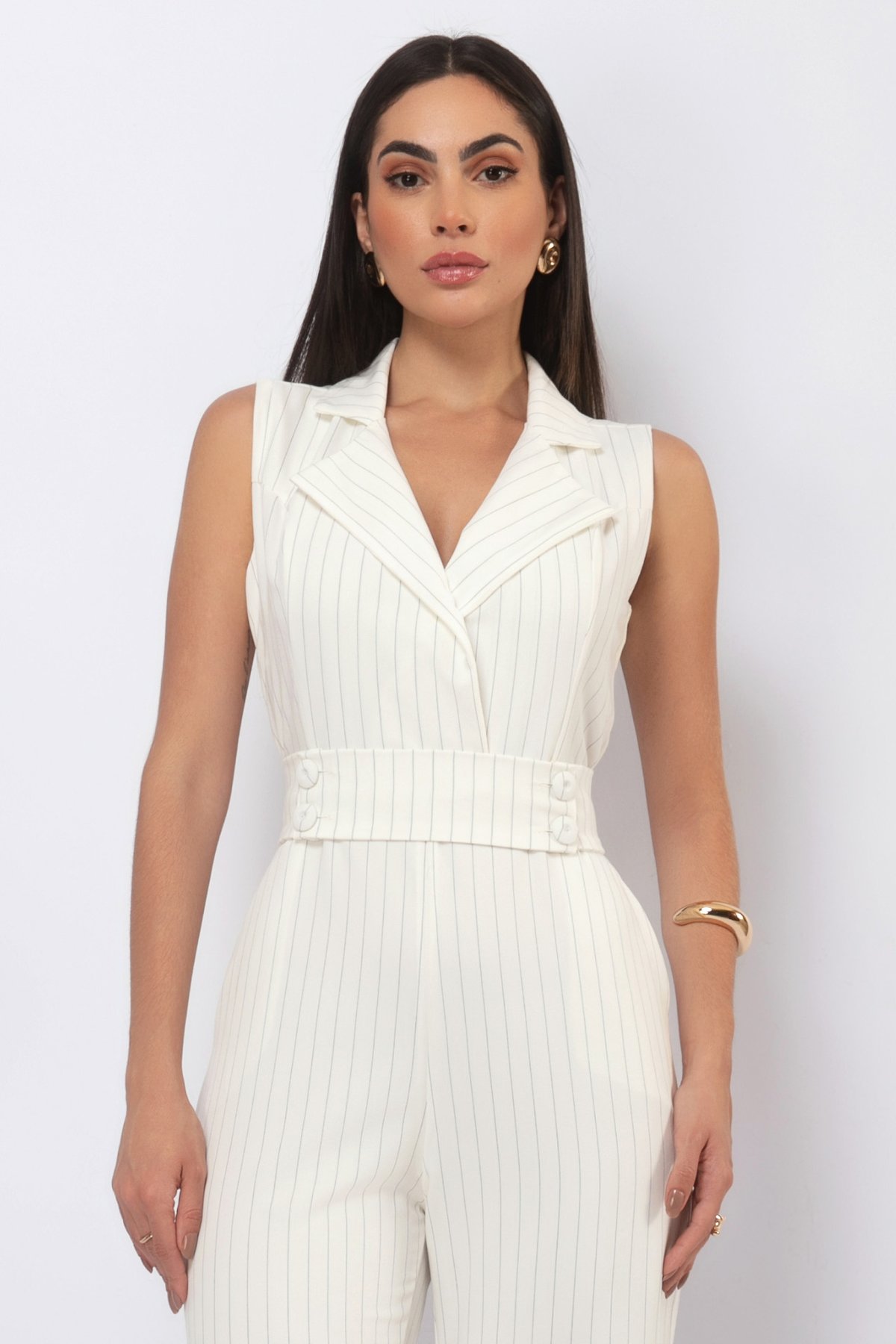 A clássica padronagem risca de giz sobre o fundo off-white é sinônimo de sofisticação. É um padrão que alonga visualmente a silhueta e confere um ar profissional e refinado, tornando a peça ideal para eventos importantes e ambientes de trabalho.