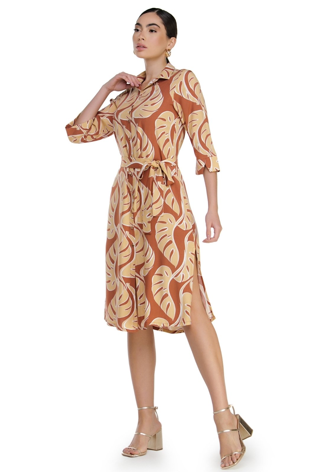 Vestido chemise confeccionado em 100% viscose, oferecendo leveza e conforto para os dias quentes. Com estampa de folhagem em tons terrosos, traz um ar tropical e elegante, ideal para diversas ocasiões. Possui mangas 3/4, cintura marcada com amarração ajustável e fenda lateral, que proporcionam movimento e feminilidade à peça. Uma escolha perfeita para um look sofisticado e despojado ao mesmo tempo.