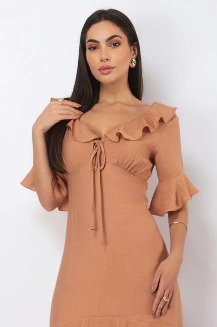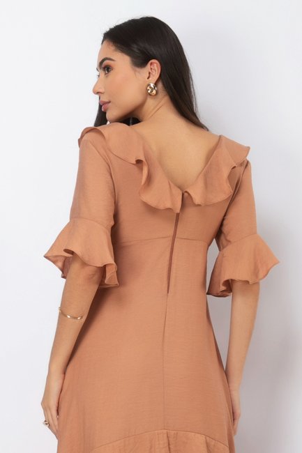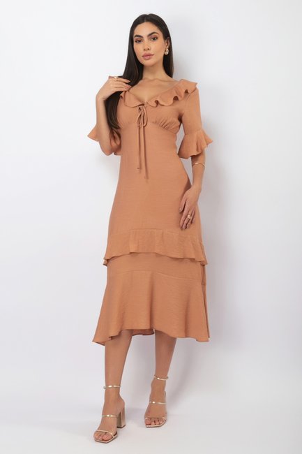 O design é um show de fluidez, com babados que emolduram o decote V (frente e costas), mangas flare que se movem com graça, e uma saia midi em camadas. Todos esses elementos criam um visual "boho chic" com um movimento espetacular ao caminhar.