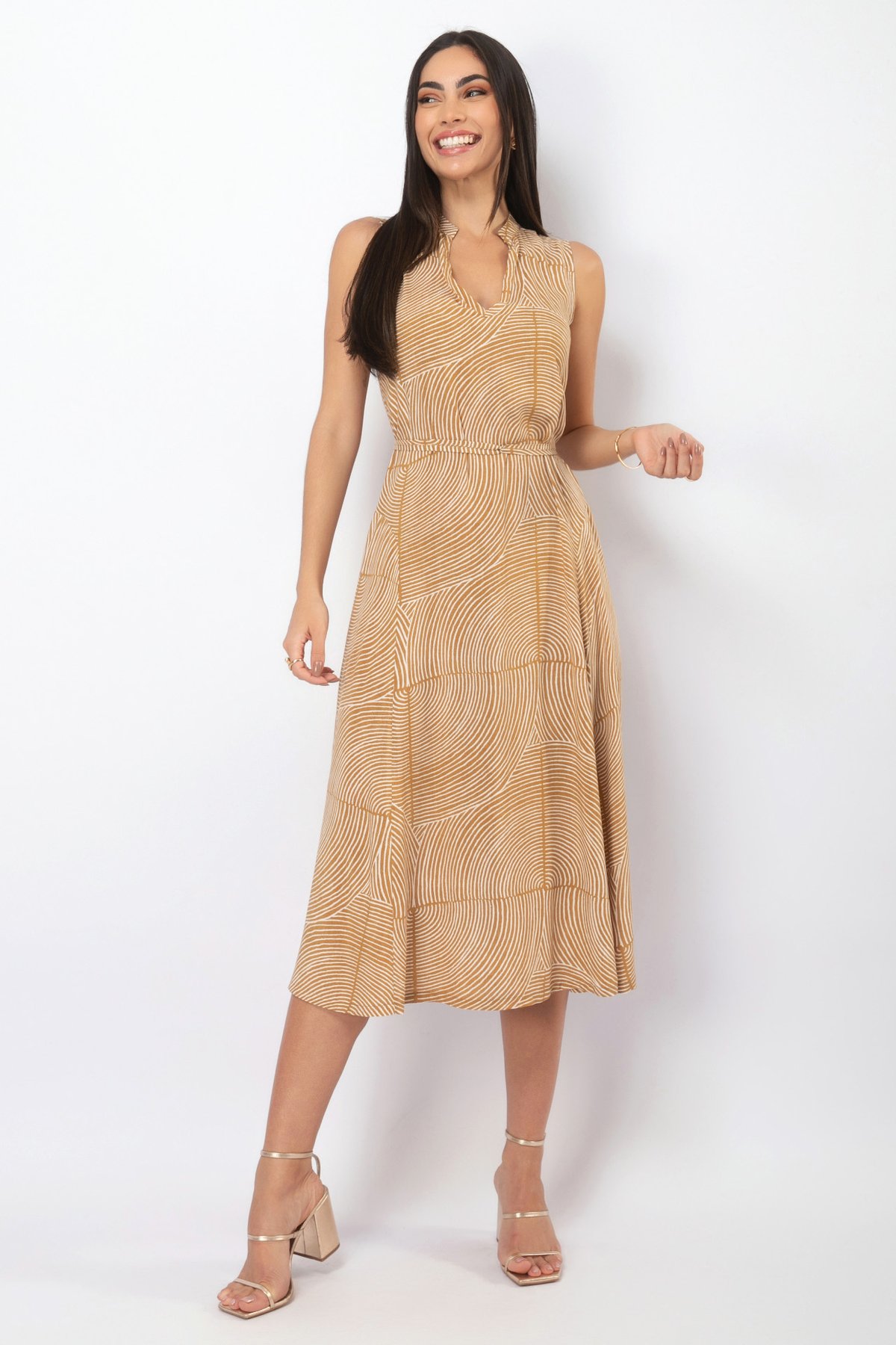 Modelagem que Valoriza a Silhueta: O vestido é sem mangas (regata), ideal para dias quentes, e conta com um cinto faixa do próprio tecido para amarração na cintura. Isso permite ajustar a peça ao corpo, definindo a silhueta de forma feminina e confortável.