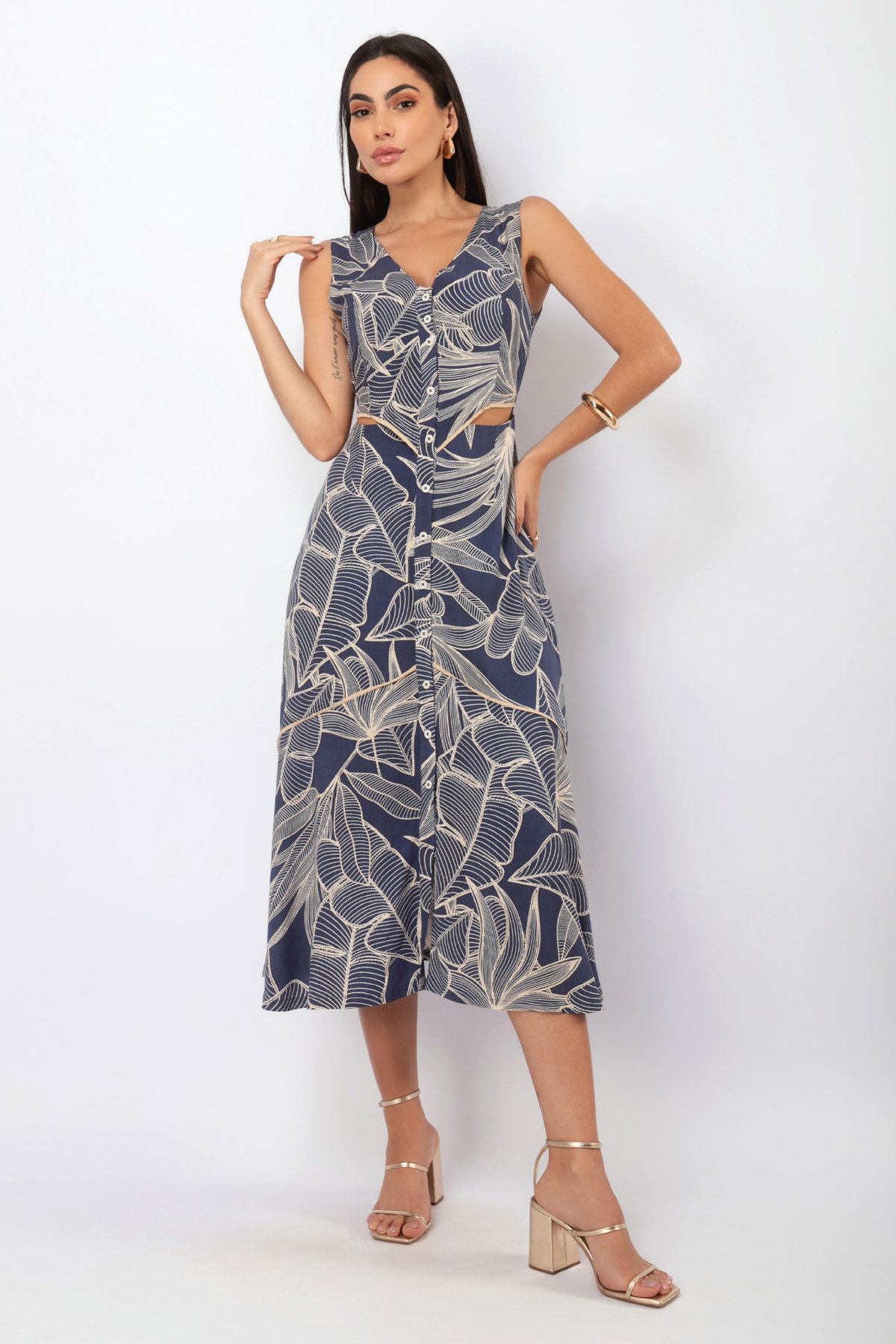 O grande diferencial do vestido são as aberturas laterais na altura da cintura. Este design "cut out" é super atual, valoriza a silhueta e cria a ilusão de um conjunto de duas peças, trazendo um toque de sensualidade e frescor ao look.