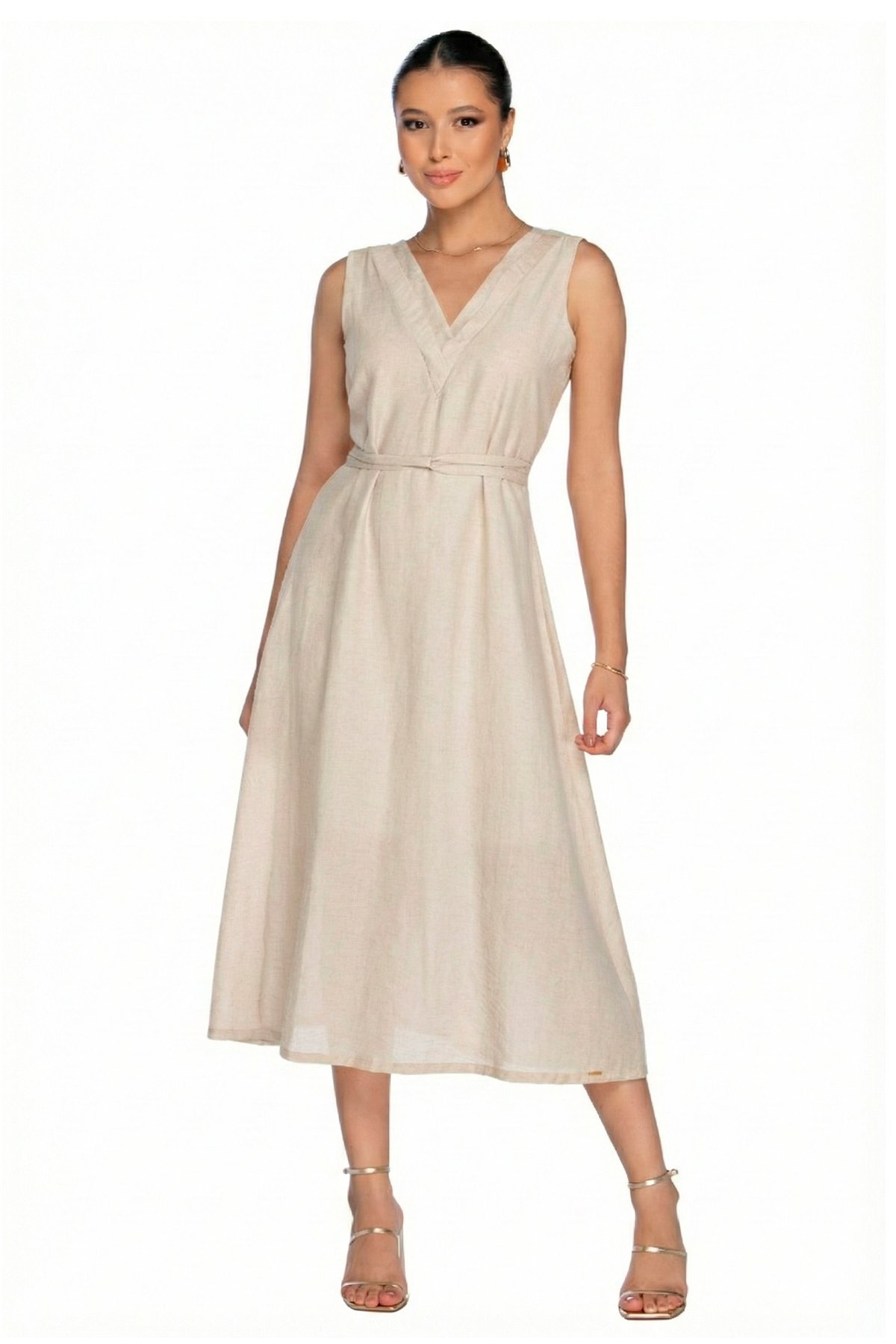 Ele apresenta um tecido que é a mistura de Viscose, Poliamida e Linho, que proporciona frescor e aspecto natural. Esse vestido é ideal para diversas ocasiões, desde eventos diurnos a um jantar especial.